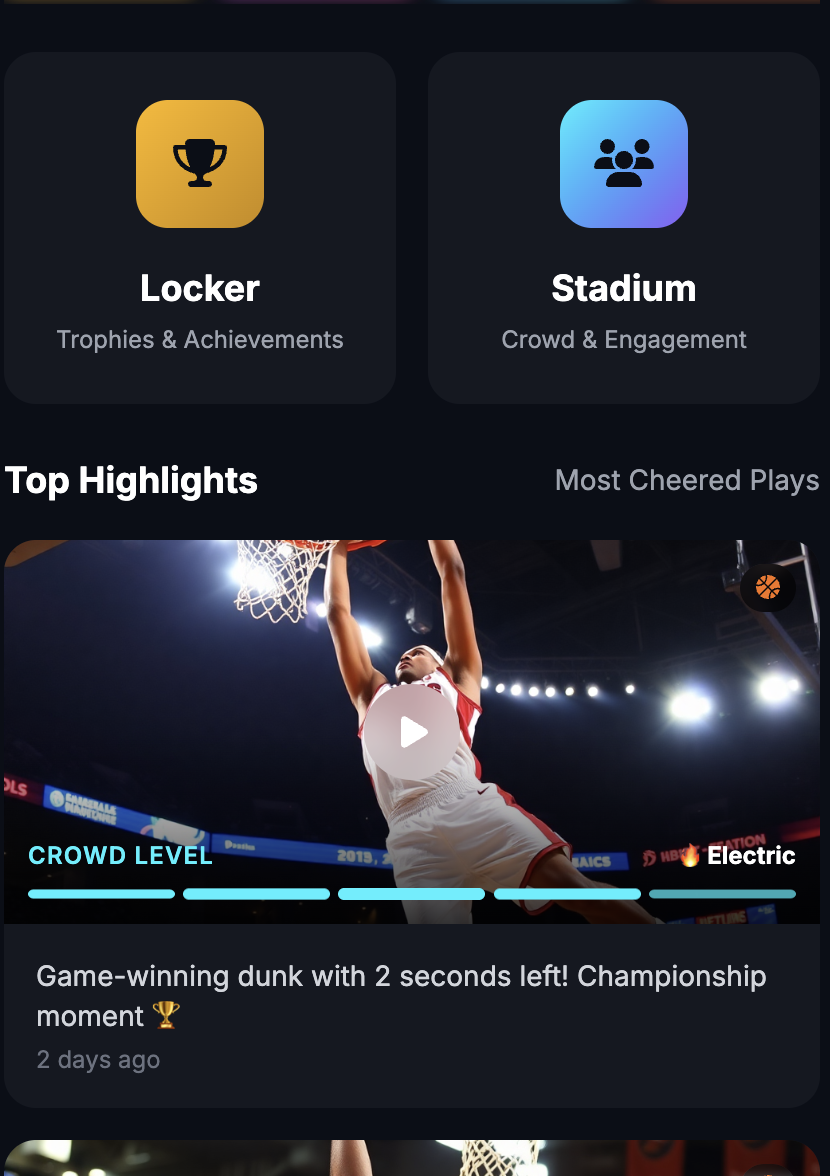 Youth / Amateur / College / ProThe top cheered-for highlights show up in the Jumbotron by level — so great plays get celebrated without needing likes, comments, or drama.