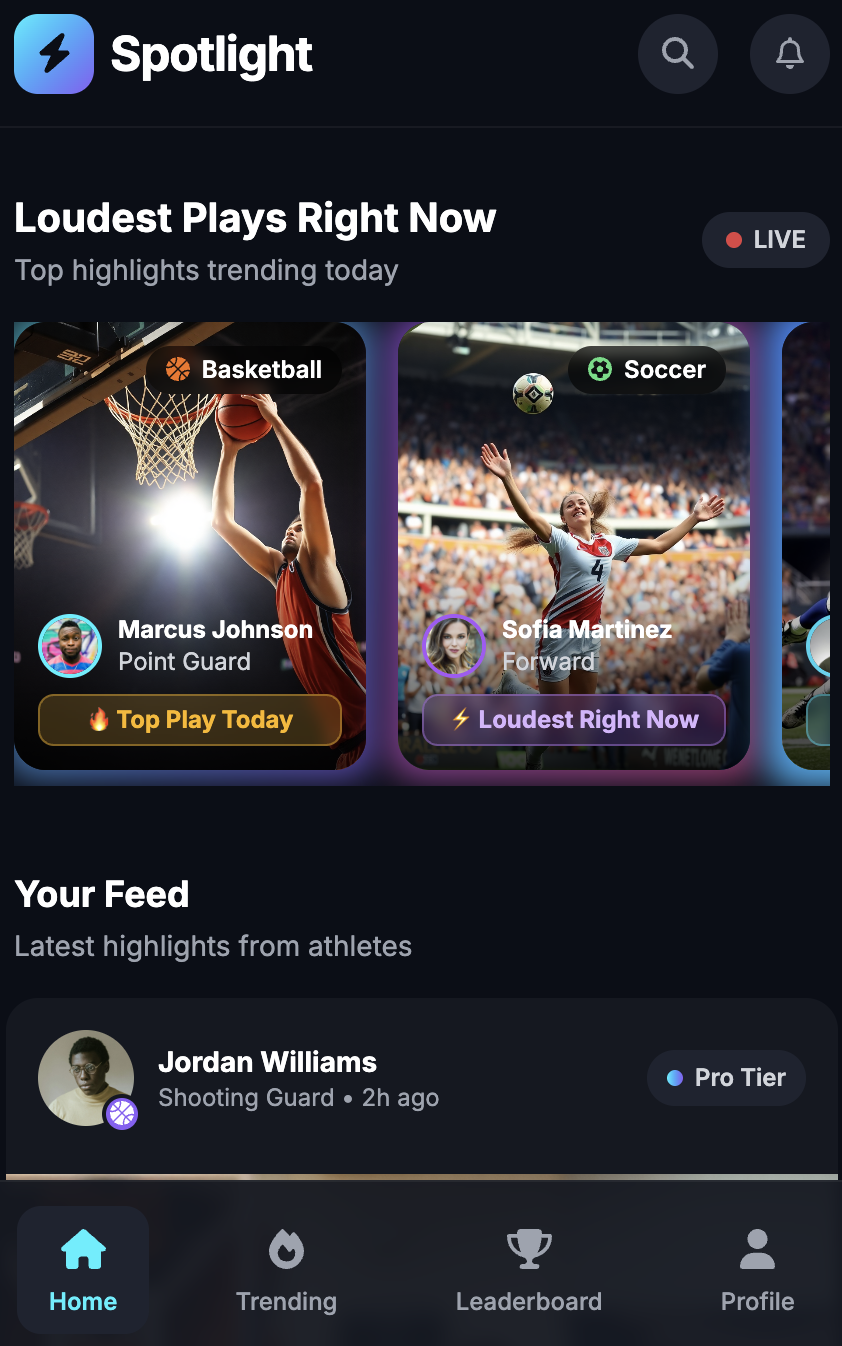 Spotlight keeps it simple: the loudest plays rise to the Jumbotron, the feed stays positive, and every athlete has a Locker where their journey lives over time.